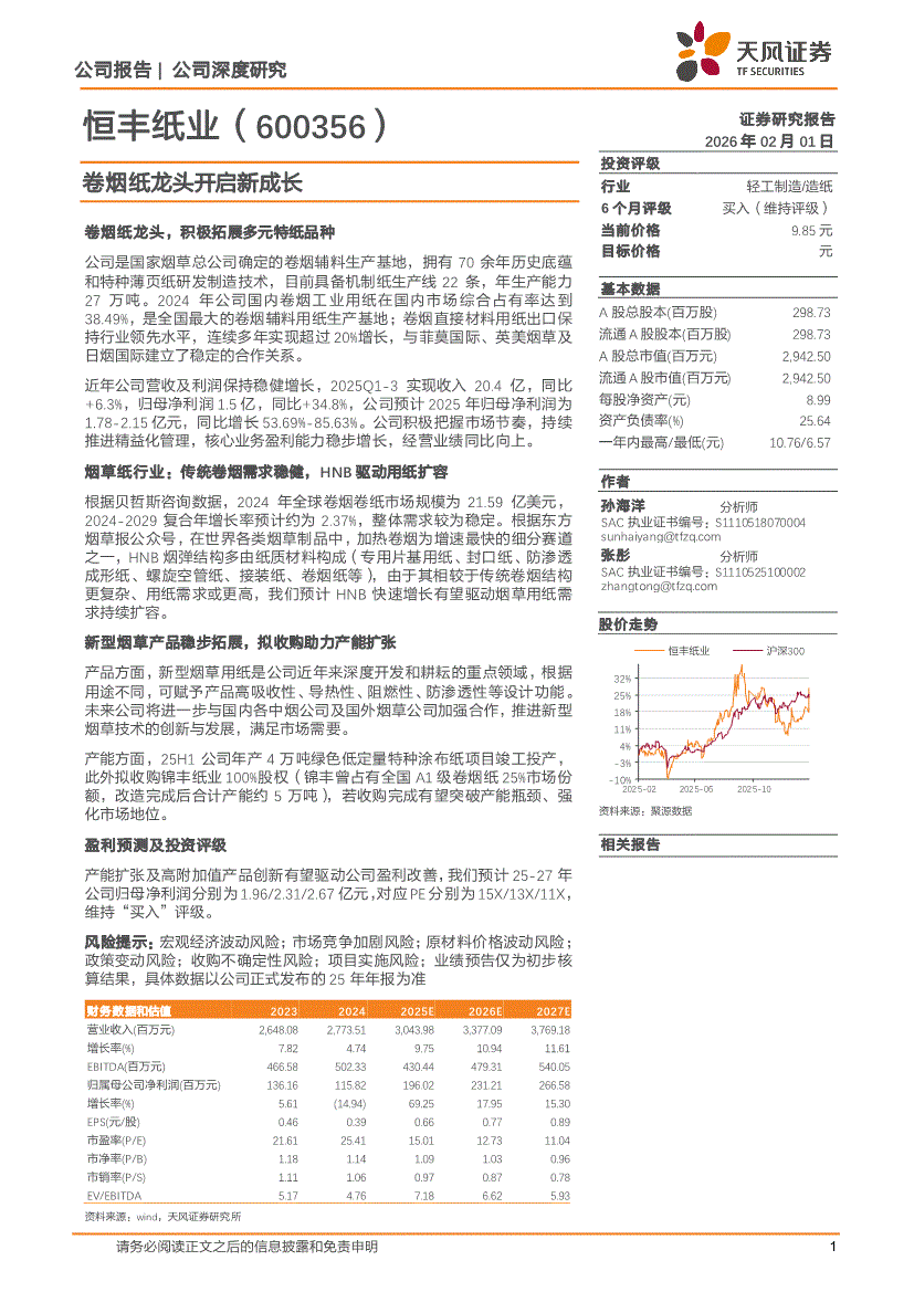 恒丰纸业:天风证券-恒丰纸业-600356-卷烟纸龙头开启新成长-260201