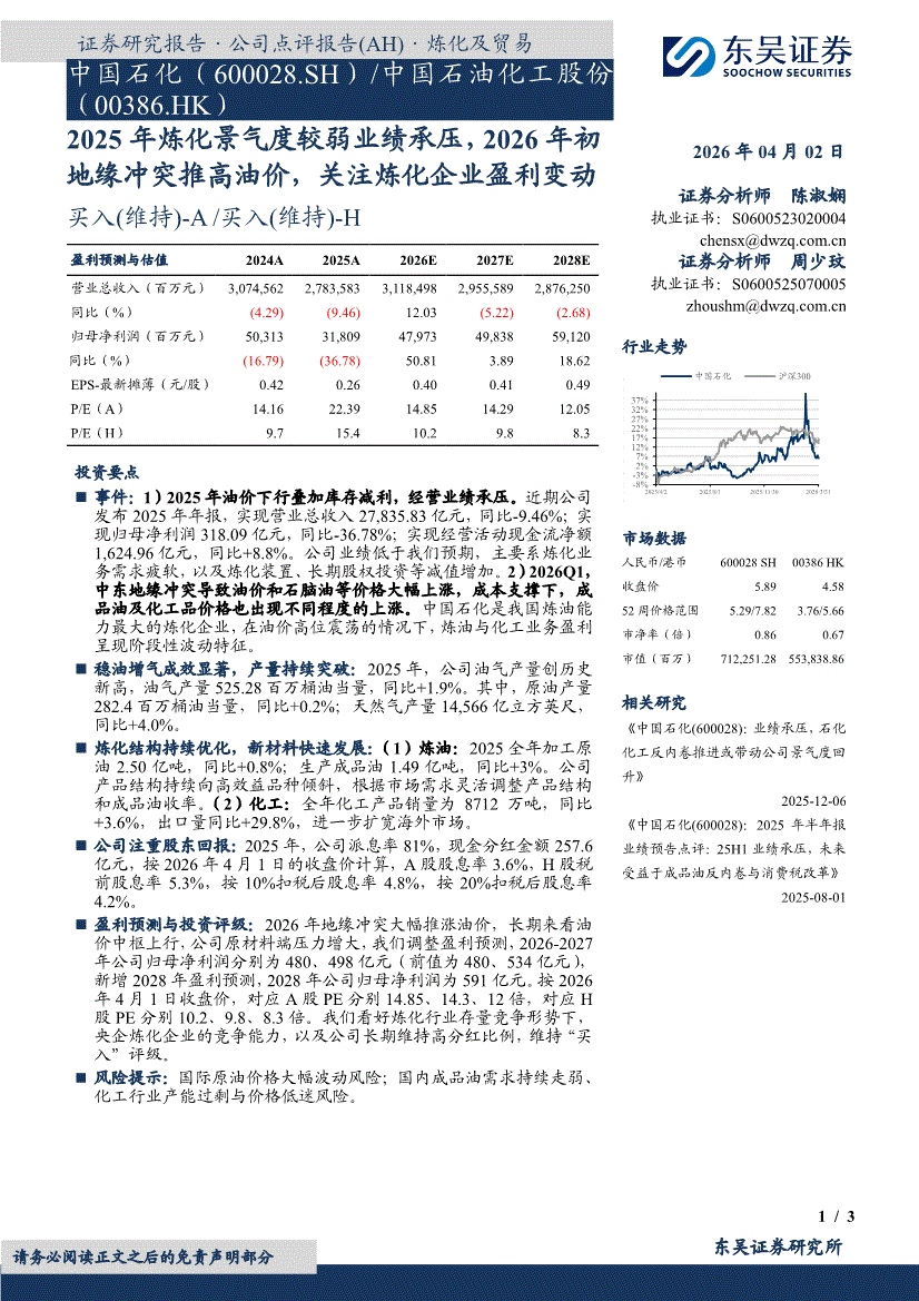 中国石化:东吴证券-中国石化-600028-2025年炼化景气度较弱业绩承压,2026年初地缘冲突推高油价,关注炼化企业盈利变动-260402