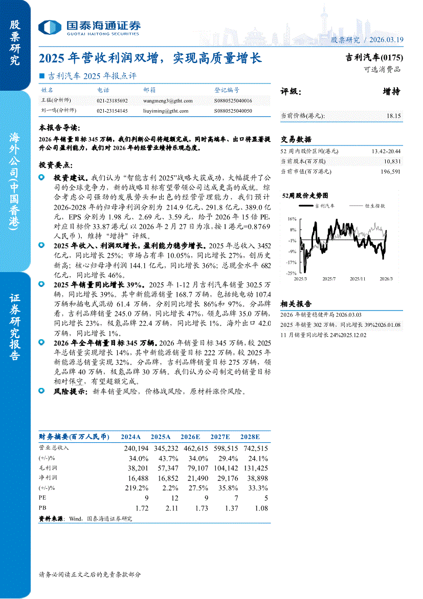 吉利汽车:国泰海通证券-吉利汽车-0175.HK-2025年报点评:2025年营收利润双增,实现高质量增长-260319