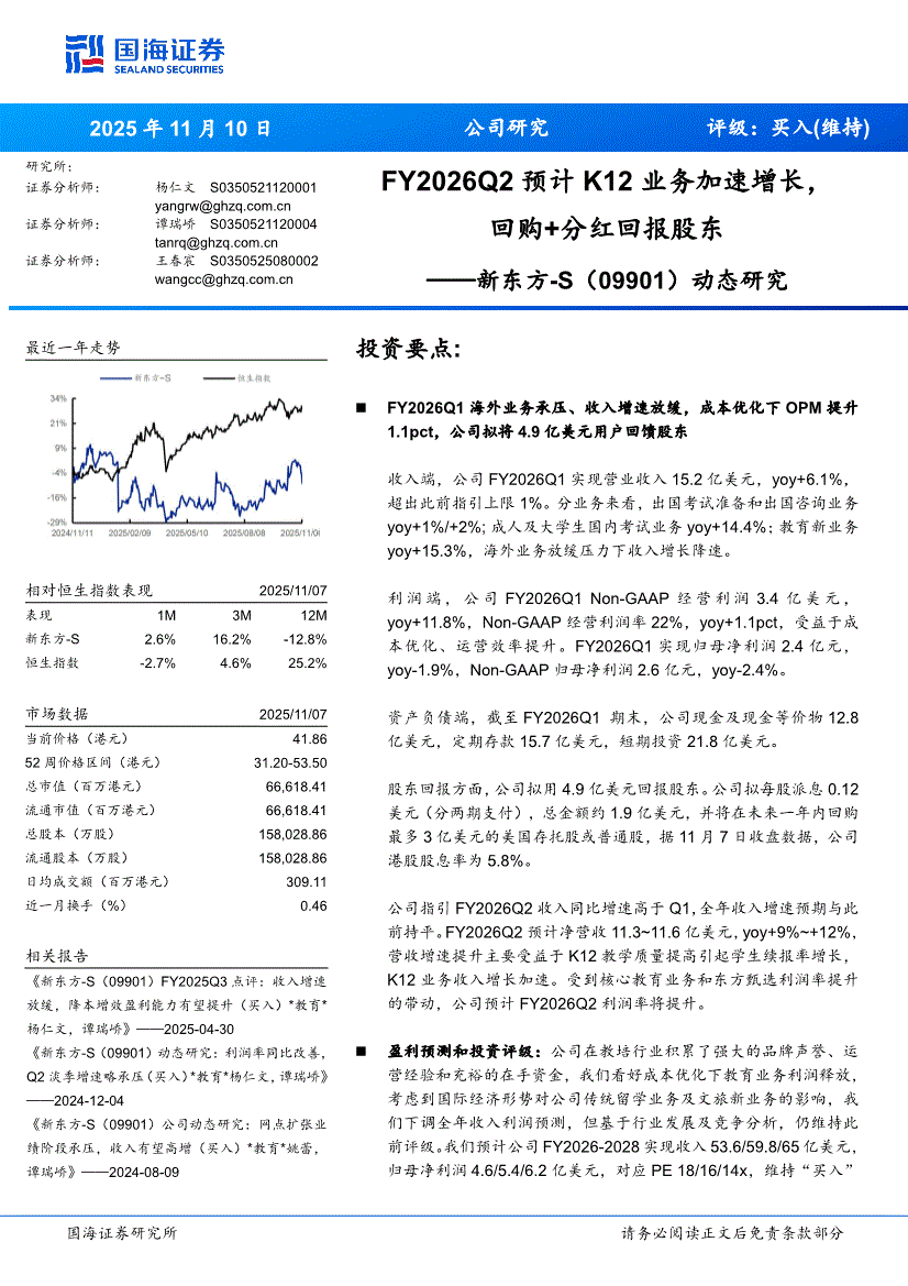 新东方~S:国海证券-新东方~S-9901.HK-动态研究:FY2026Q2预计K12业务加速增长,回购+分红回报股东-251110