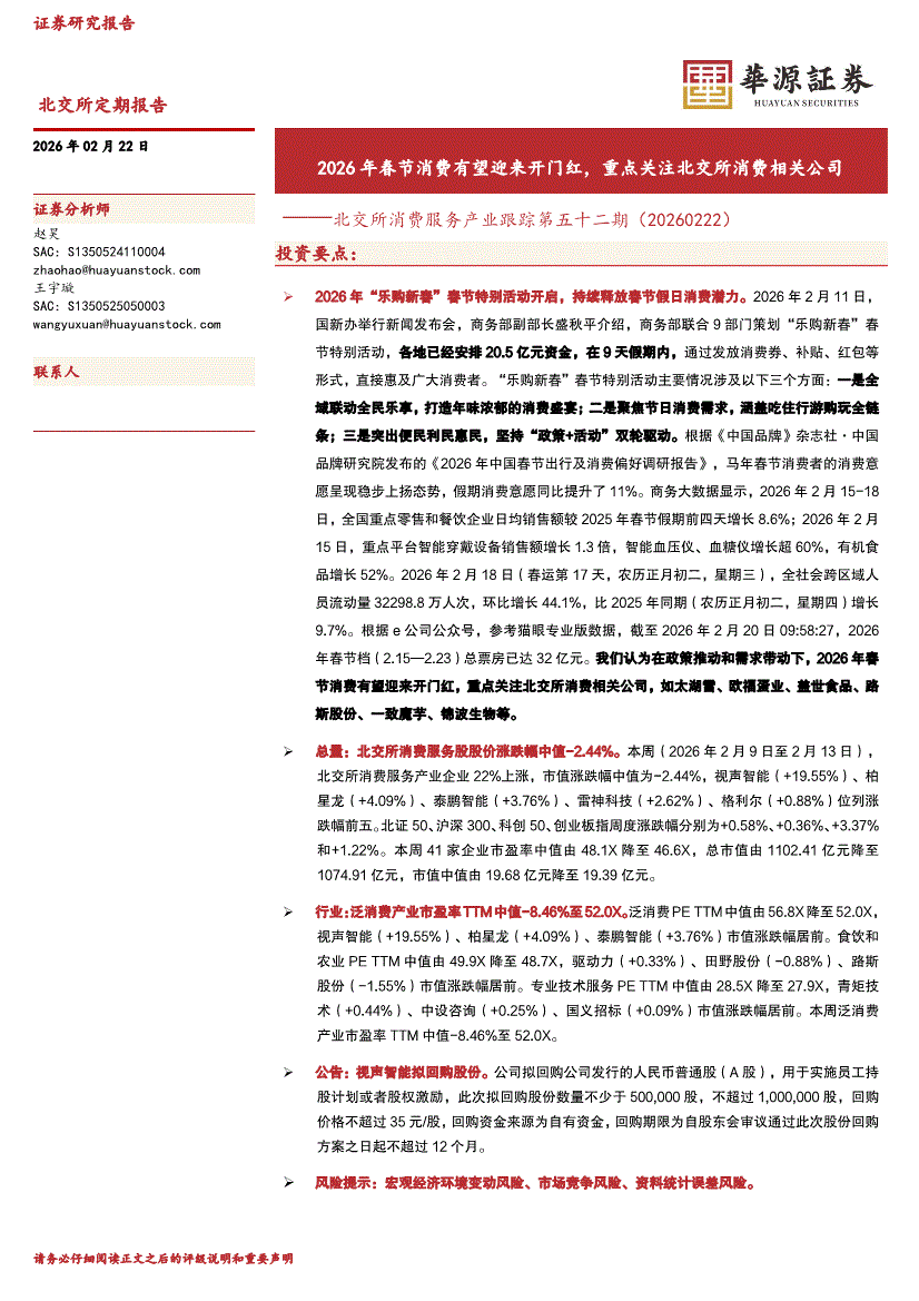 华源证券-北交所消费服务产业跟踪第五十二期:2026年春节消费有望迎来开门红,重点关注北交所消费相关公司-260222