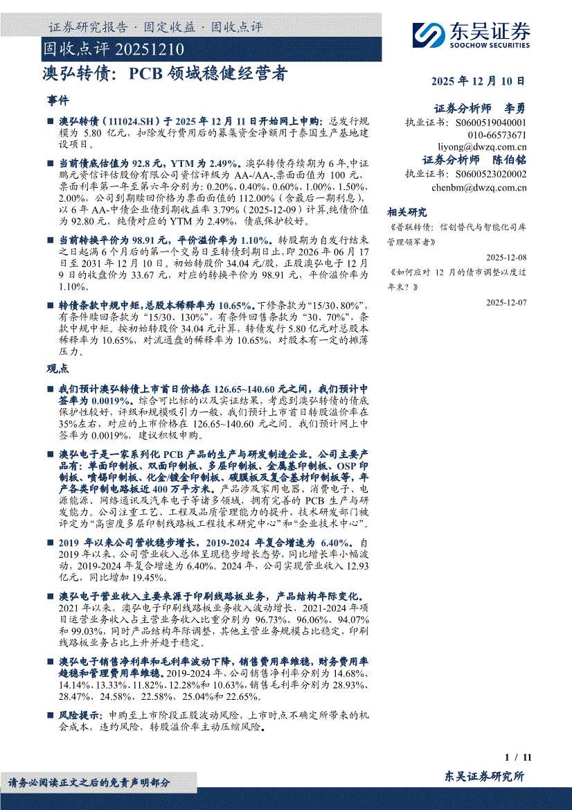 东吴证券-固收点评:澳弘转债,PCB领域稳健经营者-251210