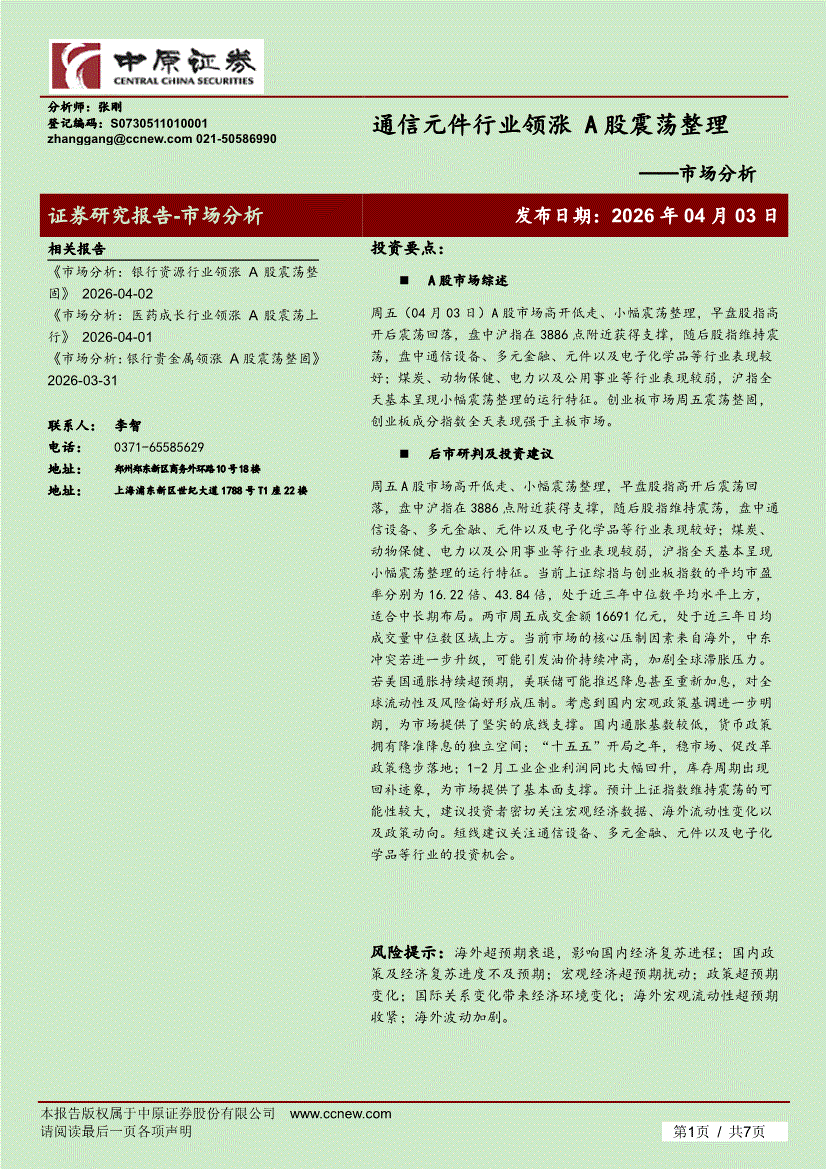 中原证券-市场分析:通信元件行业领涨,A股震荡整理-260403