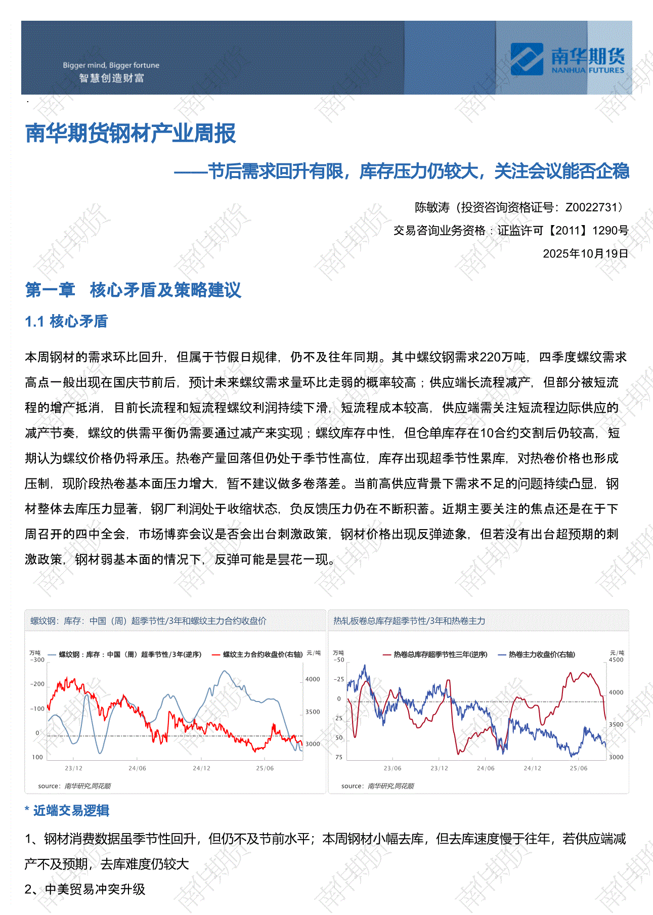 南华期货-钢材产业周报:节后需求回升有限,库存压力仍较大,关注会议能否企稳-251019