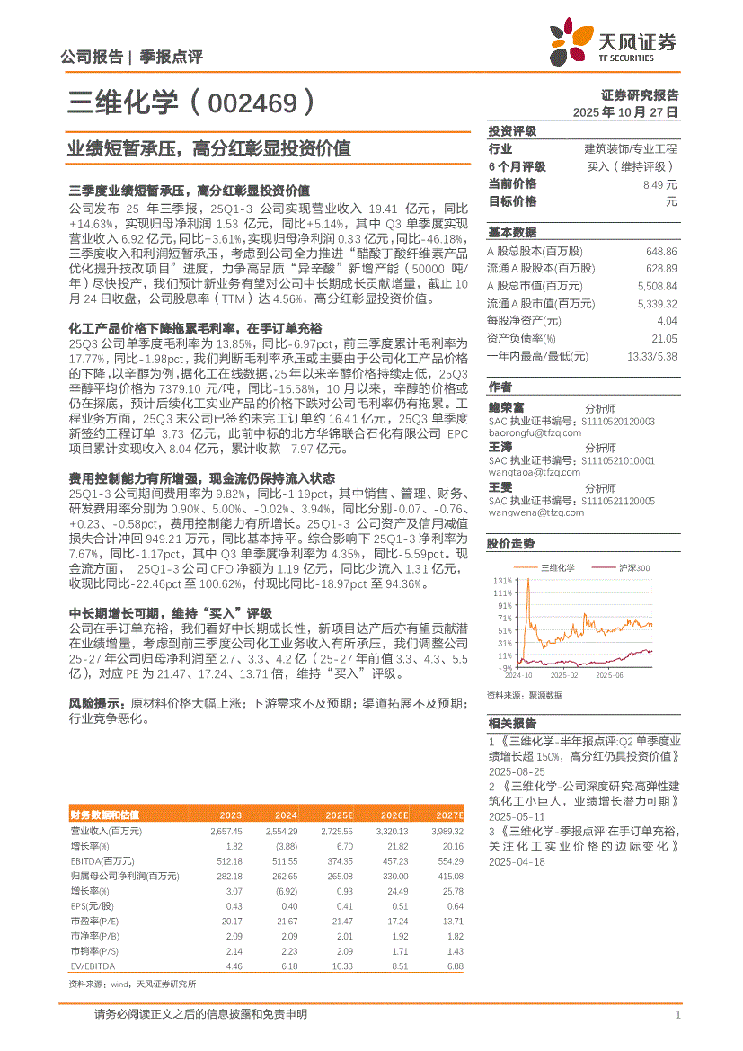 三维化学:天风证券-三维化学-002469-业绩短暂承压,高分红彰显投资价值-251027