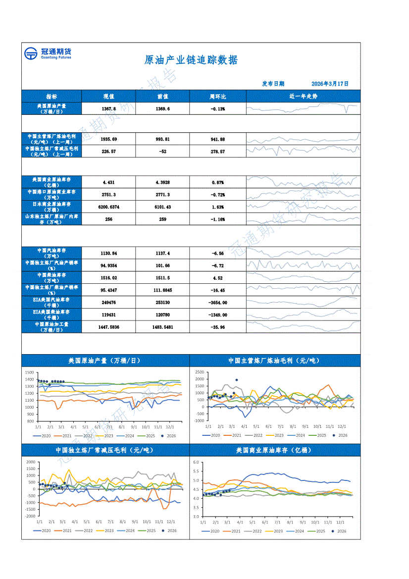冠通期货-原油产业链追踪数据-260317