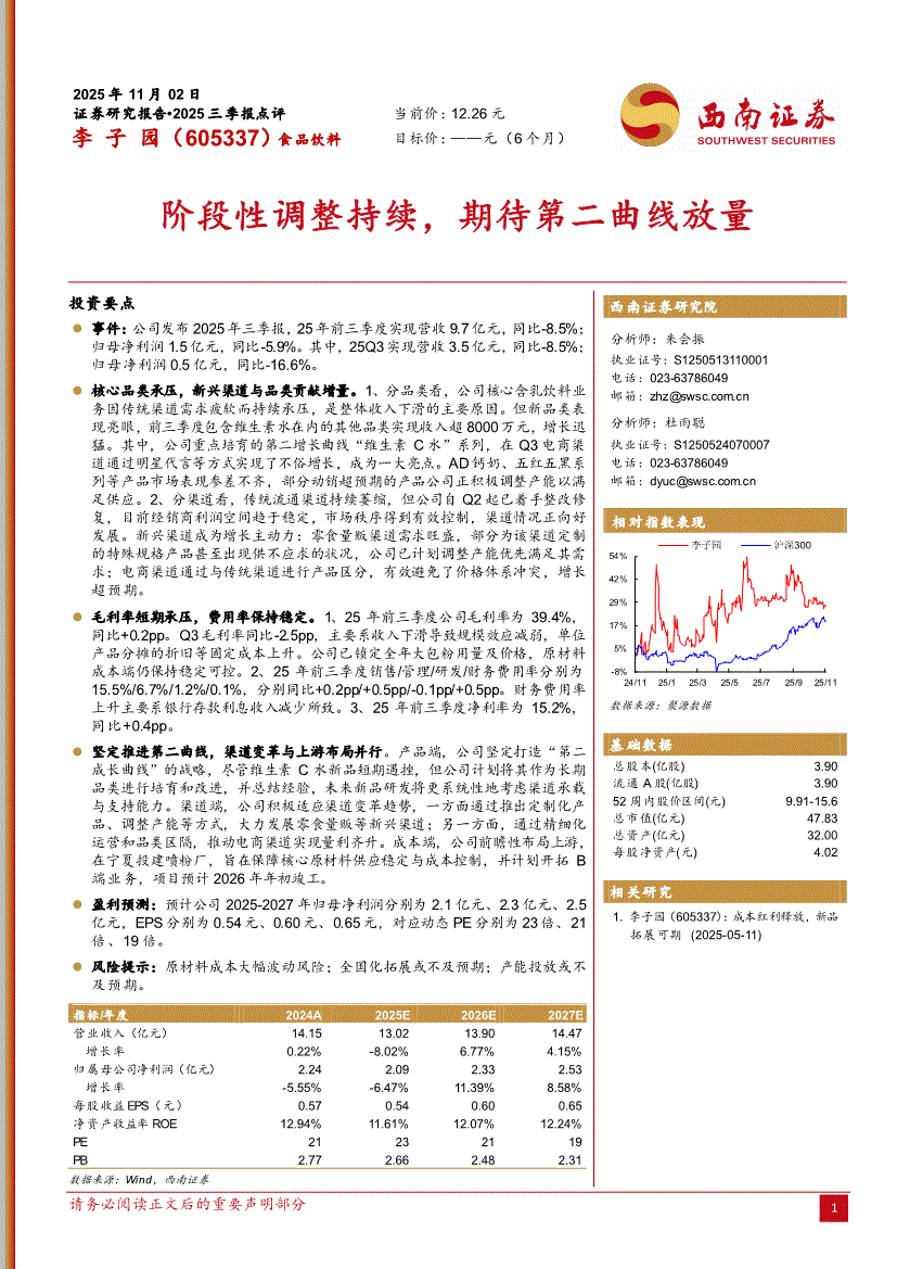 李子园:西南证券-李子园-605337-阶段性调整持续,期待第二曲线放量-251102