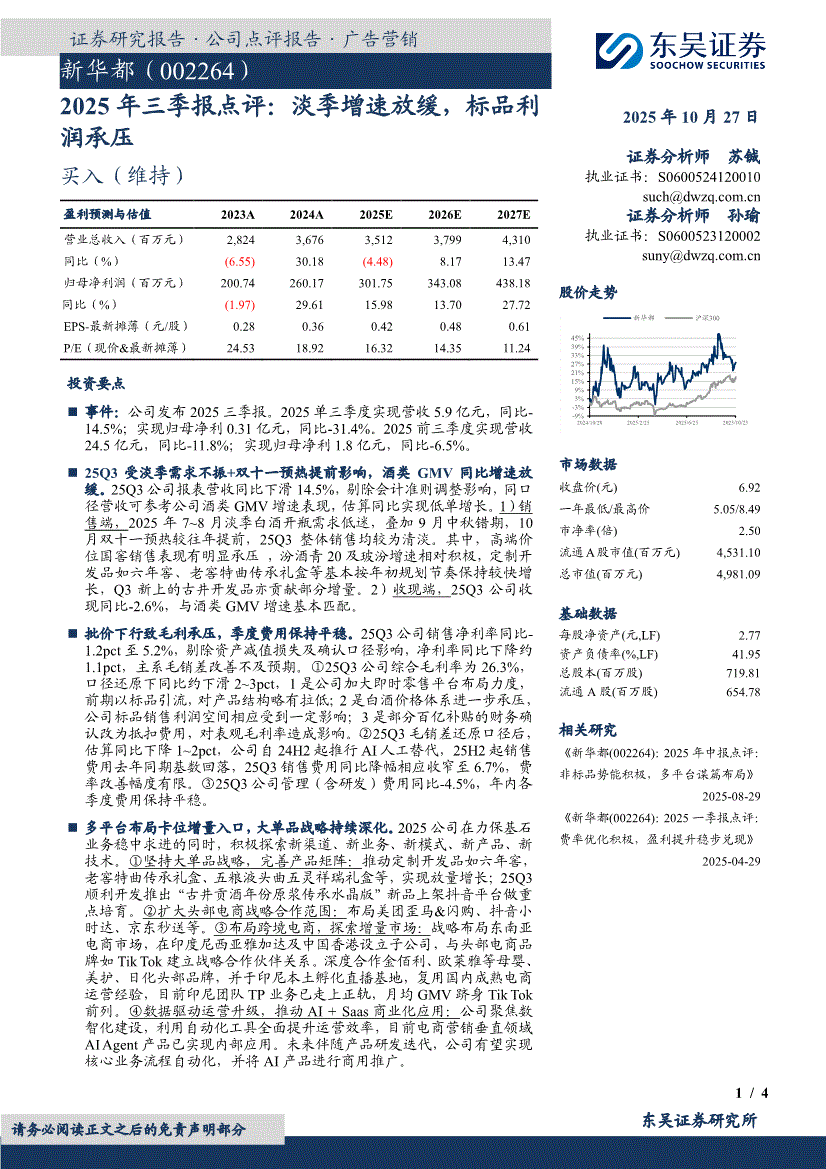 新华都:东吴证券-新华都-002264-2025年三季报点评:淡季增速放缓,标品利润承压-251027