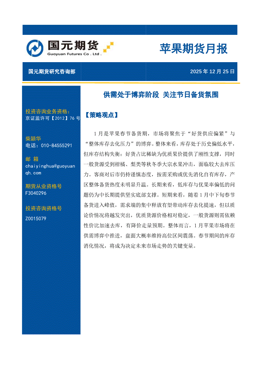 国元期货-苹果期货月报:供需处于博弈阶段,关注节日备货氛围-251225