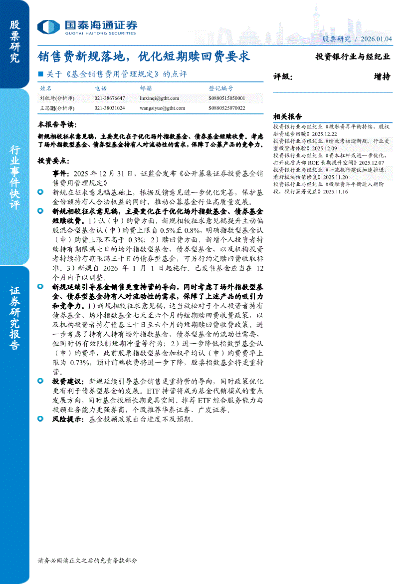 投资银行业与经纪业行业:国泰海通证券-投资银行业与经纪业行业关于《基金销售费用管理规定》的点评:销售费新规落地,优化短期赎回费要求-260104