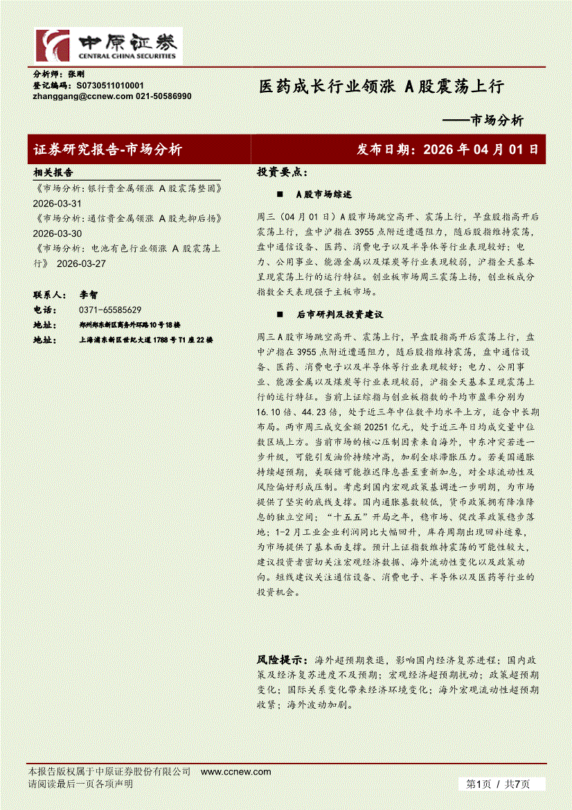 中原证券-市场分析:医药成长行业领涨,A股震荡上行-260401