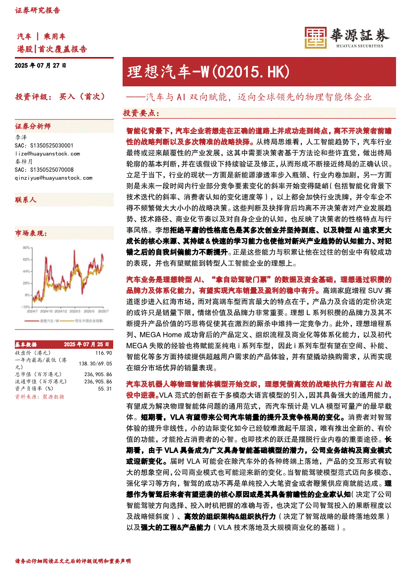 理想汽车~W:华源证券-理想汽车~W-2015.HK-汽车与AI双向赋能,迈向全球领先的物理智能体企业-250727