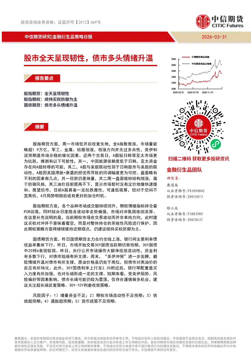 中信期货-金融衍生品策略日报:股市全天呈现韧性,债市多头情绪升温-260331