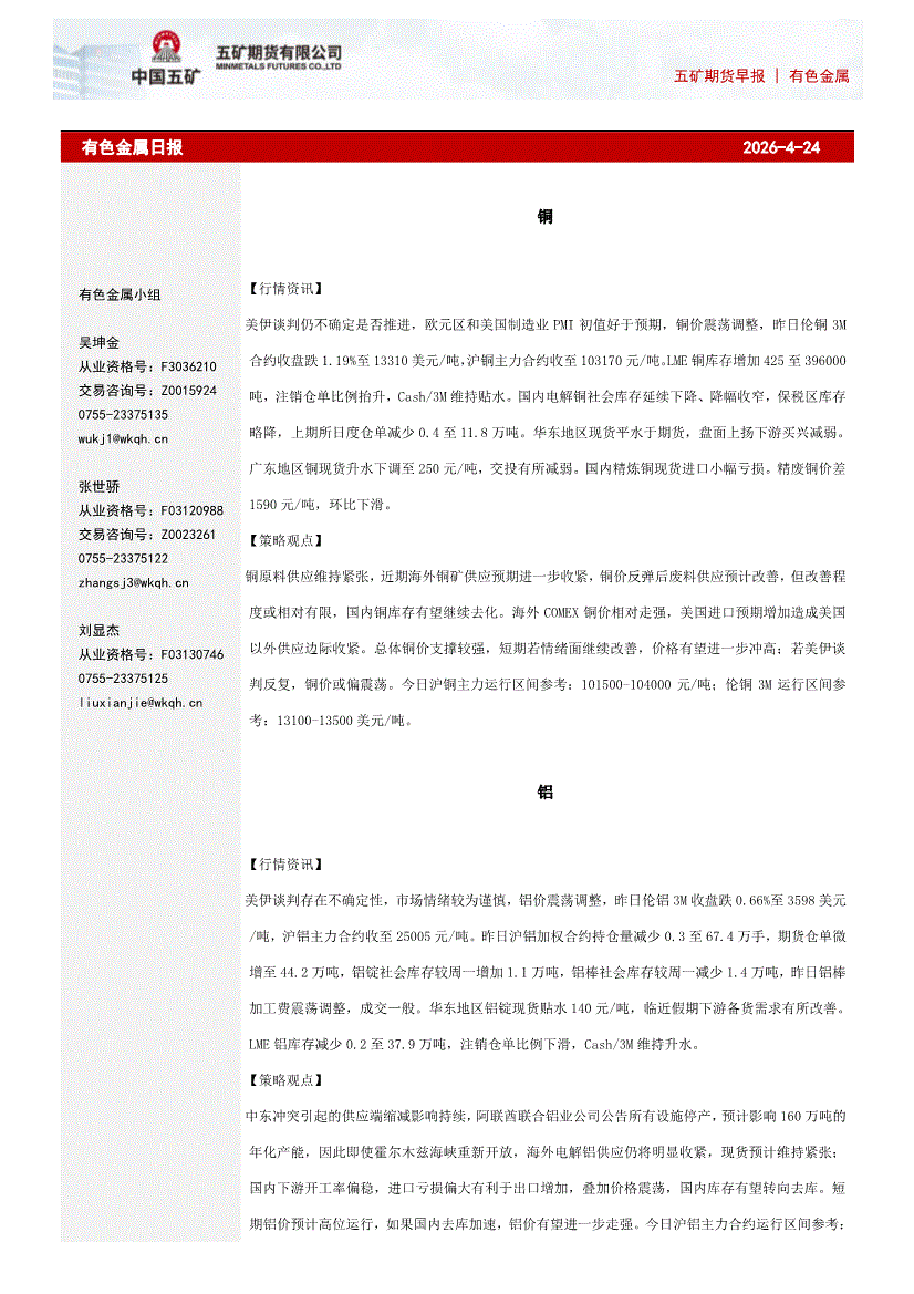 五矿期货-铜周报:原料供应紧张,支撑较强-260425