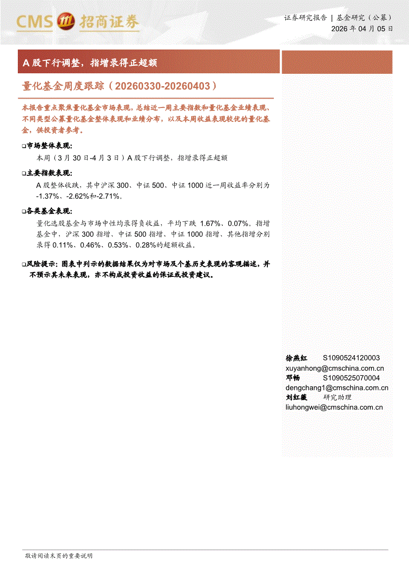 招商证券-量化基金周度跟踪:A股下行调整,指增录得正超额-260406