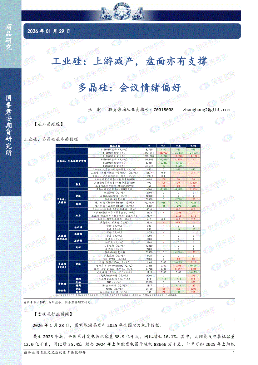 国泰君安期货-工业硅:上游减产,盘面亦有支撑,多晶硅,会议情绪偏好-260129
