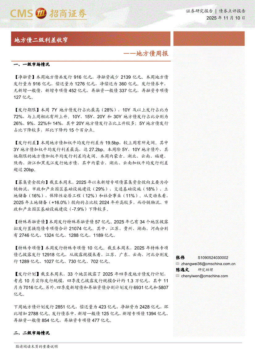 招商证券-地方债周报:地方债二级利差收窄-251110