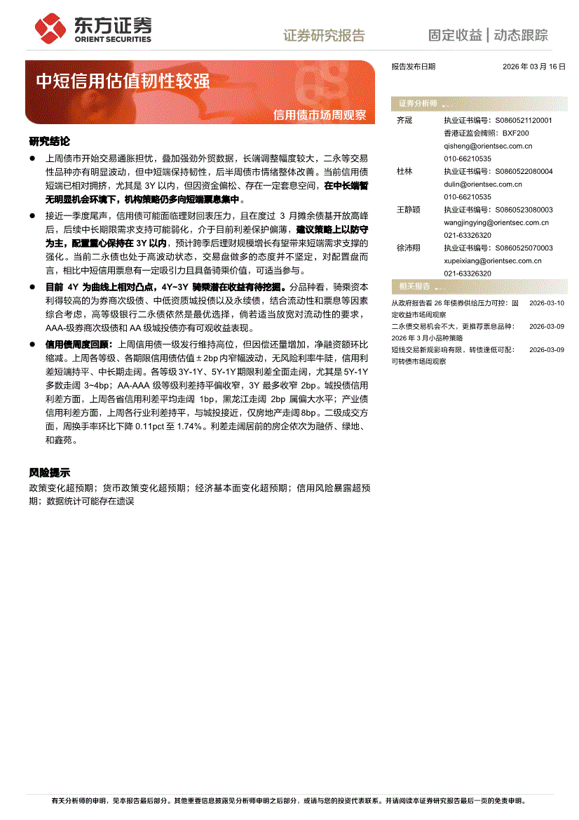东方证券-信用债市场周观察:中短信用估值韧性较强-260316