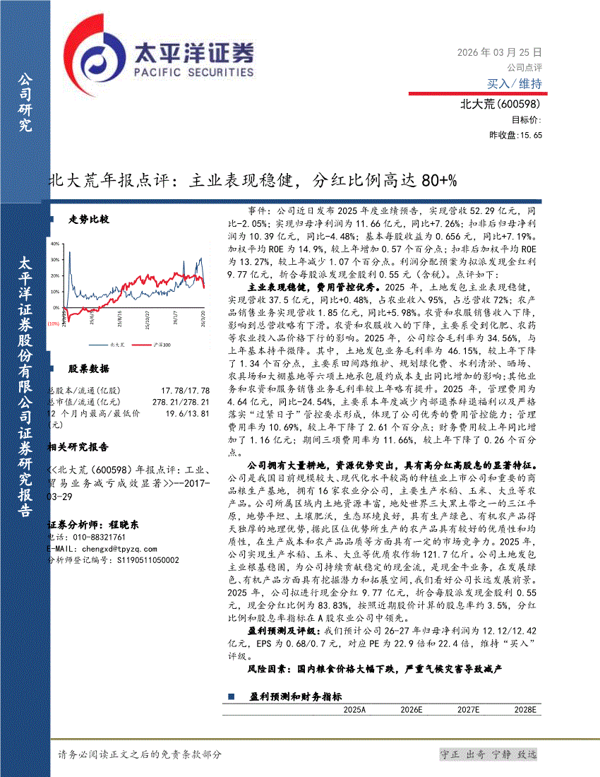 北大荒:太平洋证券-北大荒-600598-年报点评:主业表现稳健,分红比例高达80+%-260325