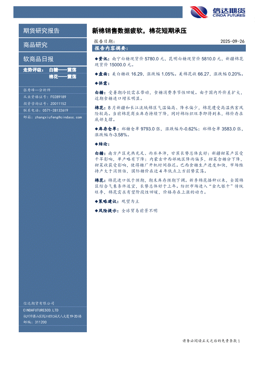 信达期货-软商品日报:新棉销售数据疲软,棉花短期承压-250926