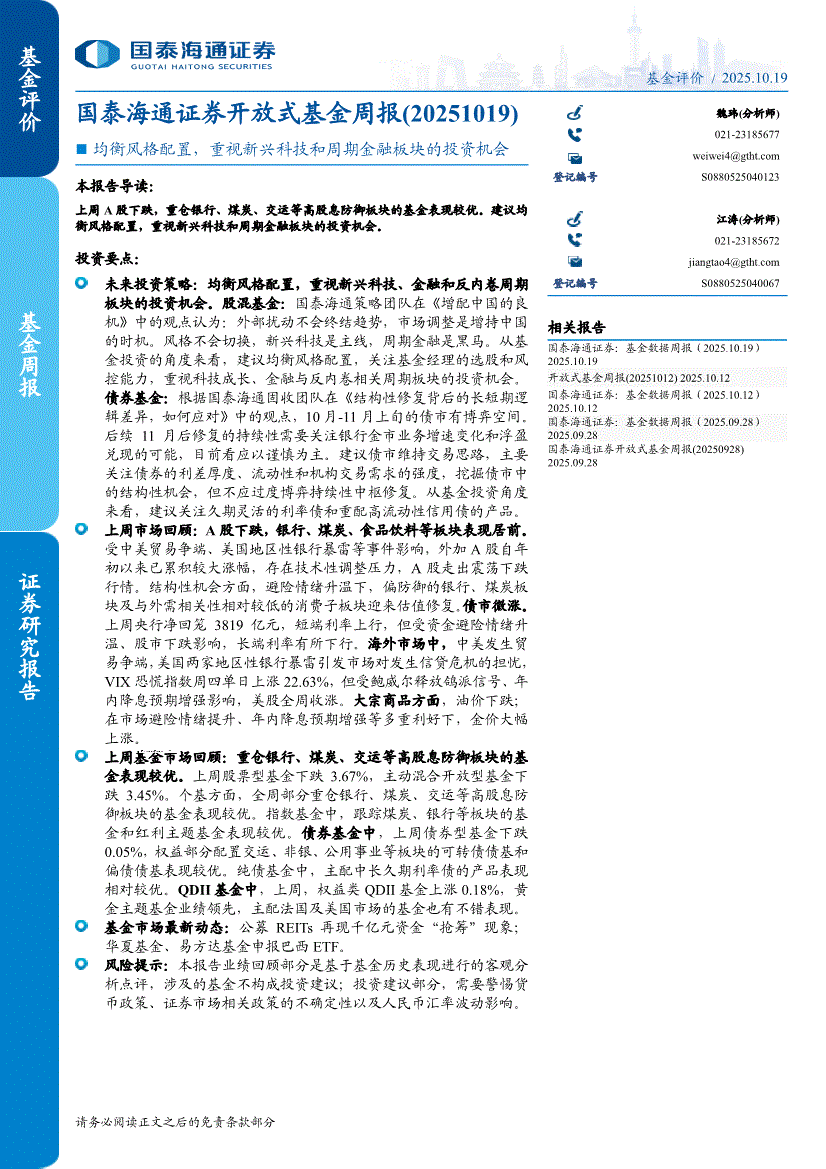 国泰海通证券-开放式基金周报:均衡风格配置,重视新兴科技和周期金融板块的投资机会-251019