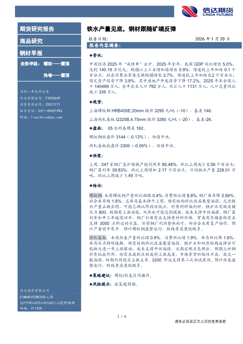 信达期货-钢材早报:铁水产量见底,钢材跟随矿端反弹-260120