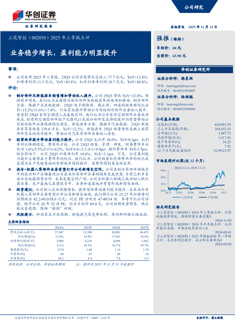 三花智控:华创证券-三花智控-002050-2025年三季报点评:业务稳步增长,盈利能力明显提升-251112
