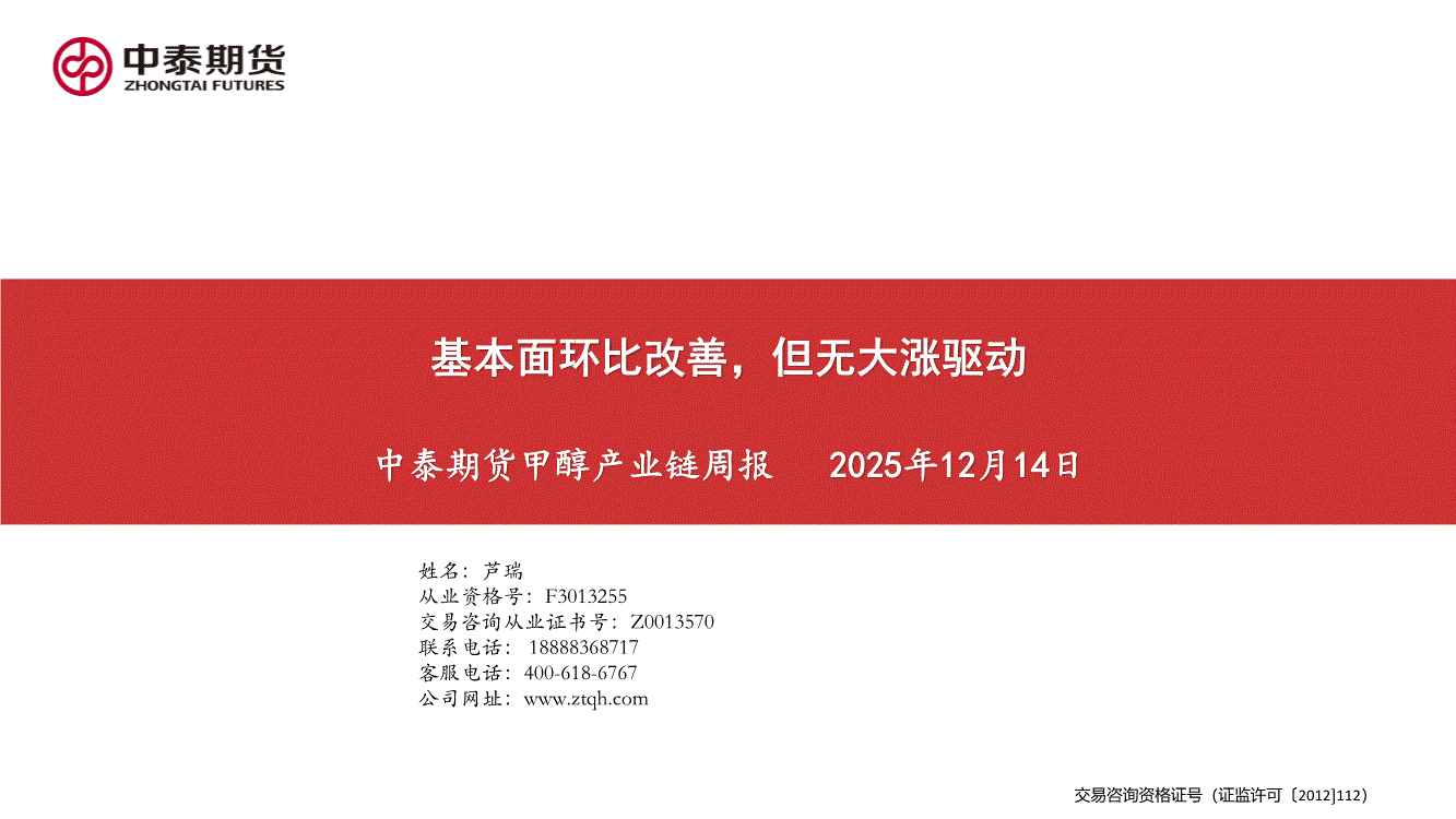 中泰期货-甲醇产业链周报:基本面环比改善,但无大涨驱动-251214