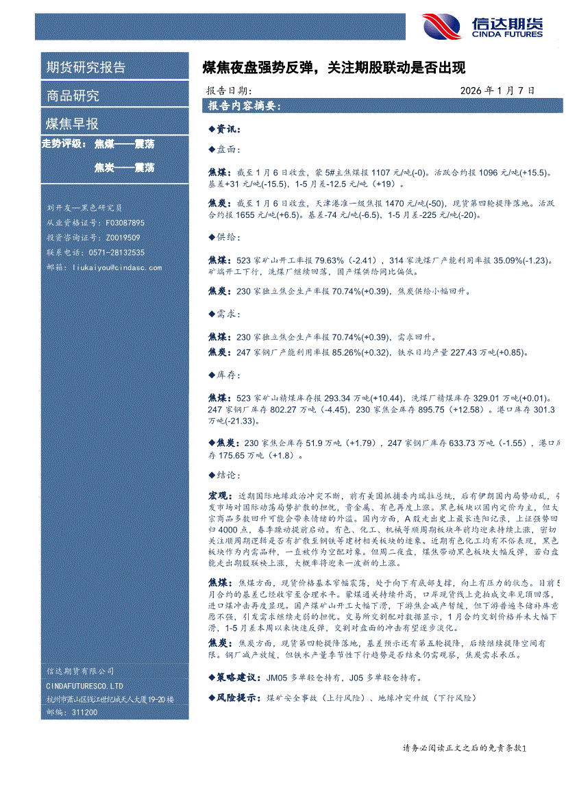 信达期货-煤焦早报:煤焦夜盘强势反弹,关注期股联动是否出现-260107