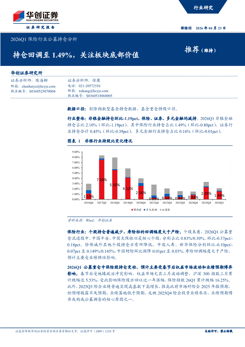 保险行业:华创证券-2026Q1保险行业公募持仓分析:持仓回调至1.49%,关注板块底部价值-260423