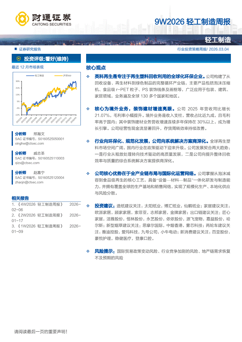 轻工制造行业:财通证券-9W2026轻工制造行业周报-260304