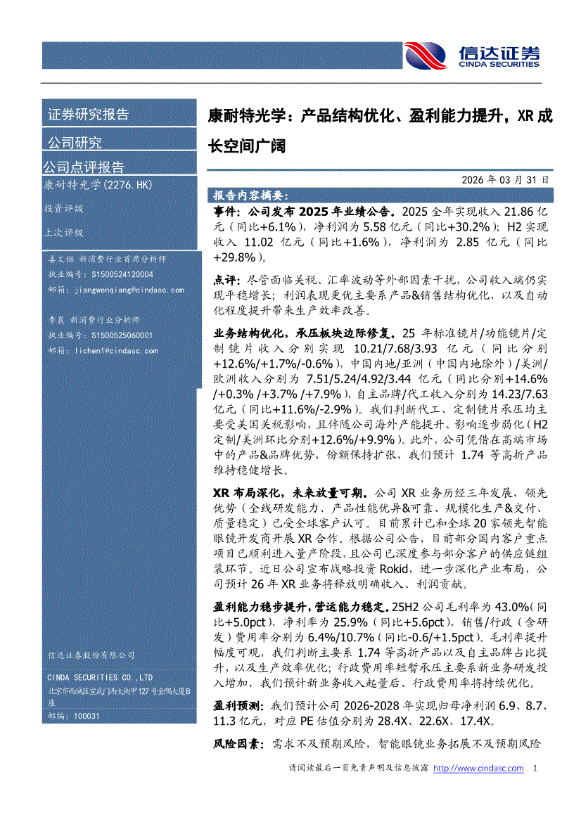 康耐特光学:信达证券-康耐特光学-2276.HK-产品结构优化、盈利能力提升,XR成长空间广阔-260331