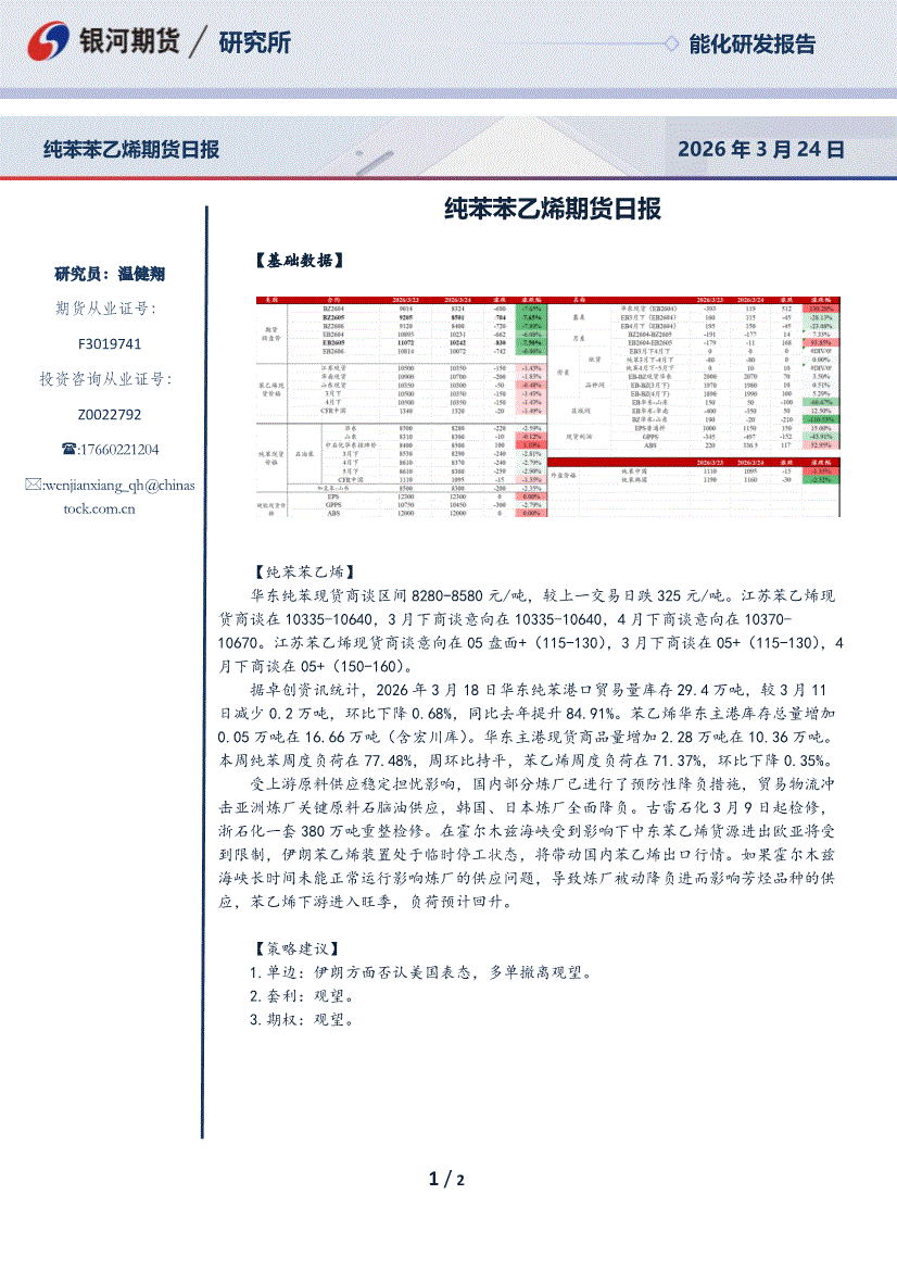 银河期货-纯苯苯乙烯期货日报-260331
