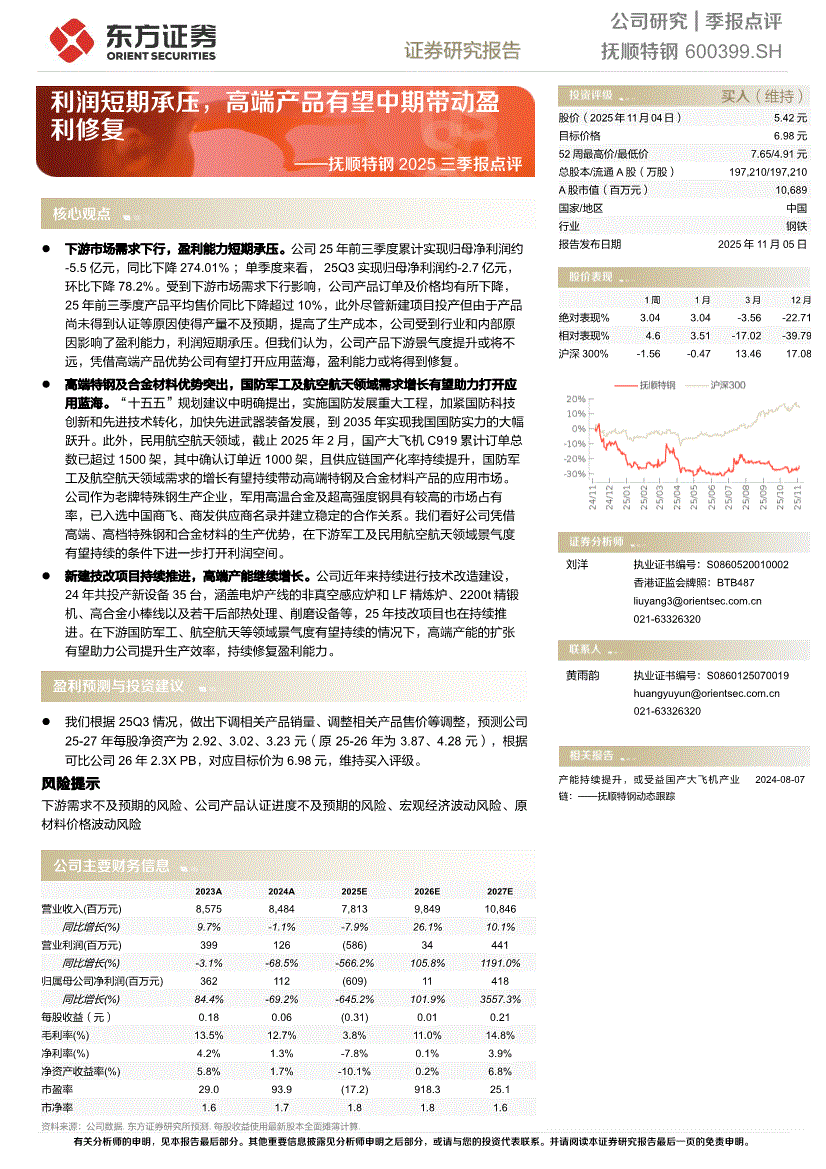 抚顺特钢:东方证券-抚顺特钢-600399-2025三季报点评:利润短期承压,高端产品有望中期带动盈利修复-251105