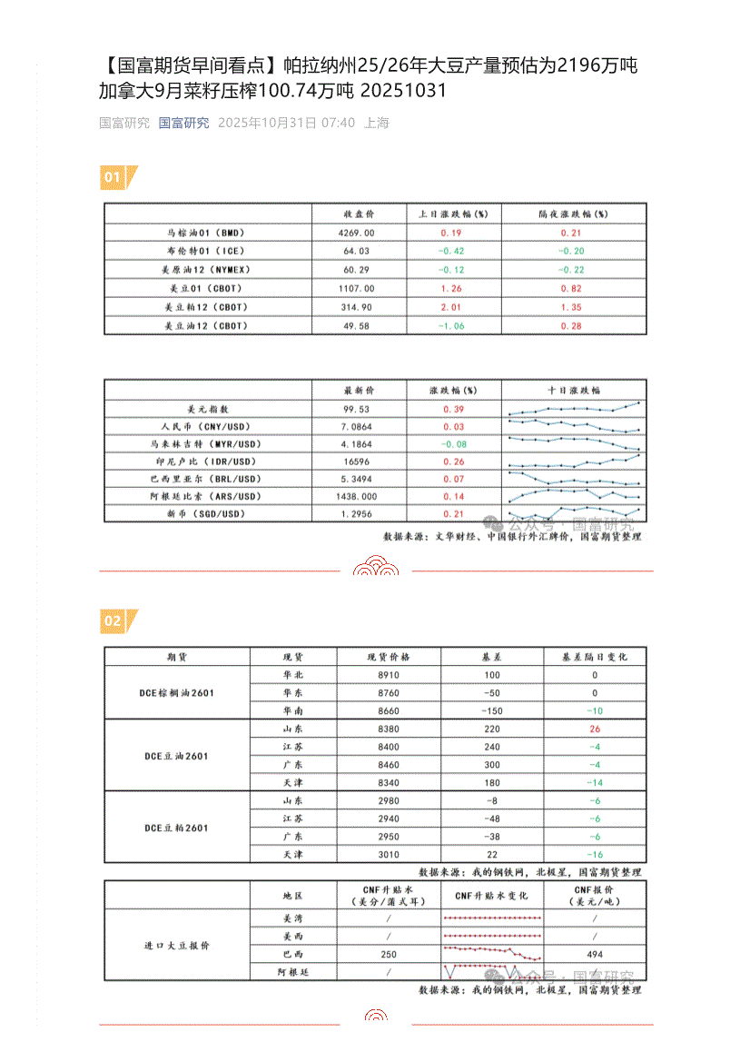 国富期货-【早间看点】帕拉纳州25/26年大豆产量预估为2196万吨,加拿大9月菜籽压榨100.74万吨-251031