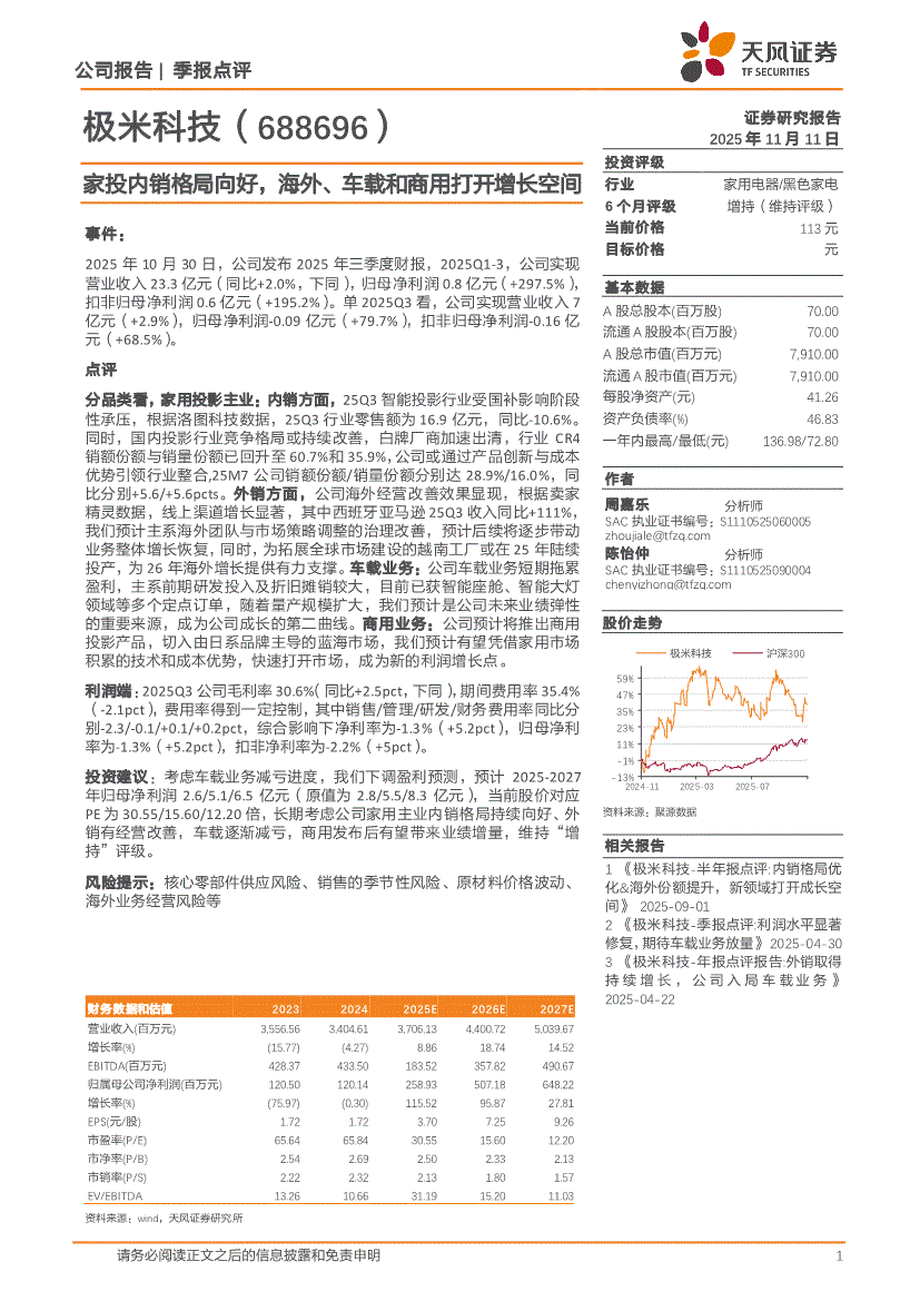极米科技:天风证券-极米科技-688696-家投内销格局向好,海外、车载和商用打开增长空间-251111