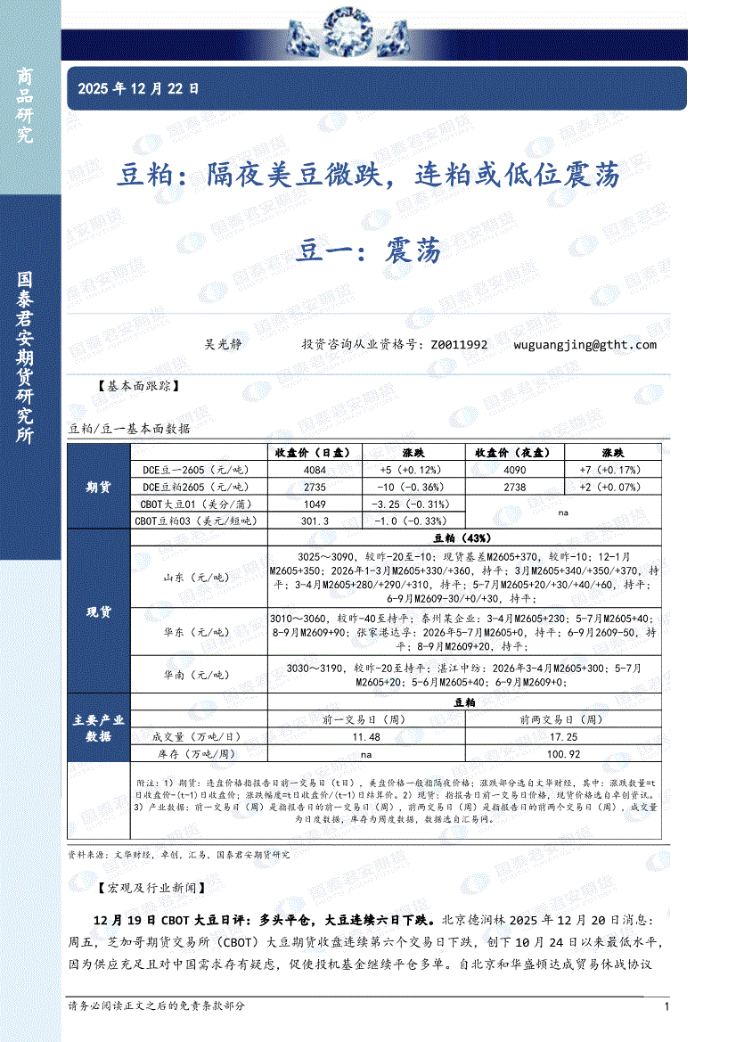国泰君安期货-豆粕:隔夜美豆微跌,豆粕或低位震荡,豆一,震荡-251222