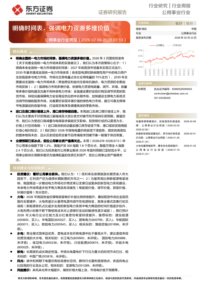 公用事业行业:东方证券-公用事业行业周报:明确时间表,强调电力资源多维价值-260223