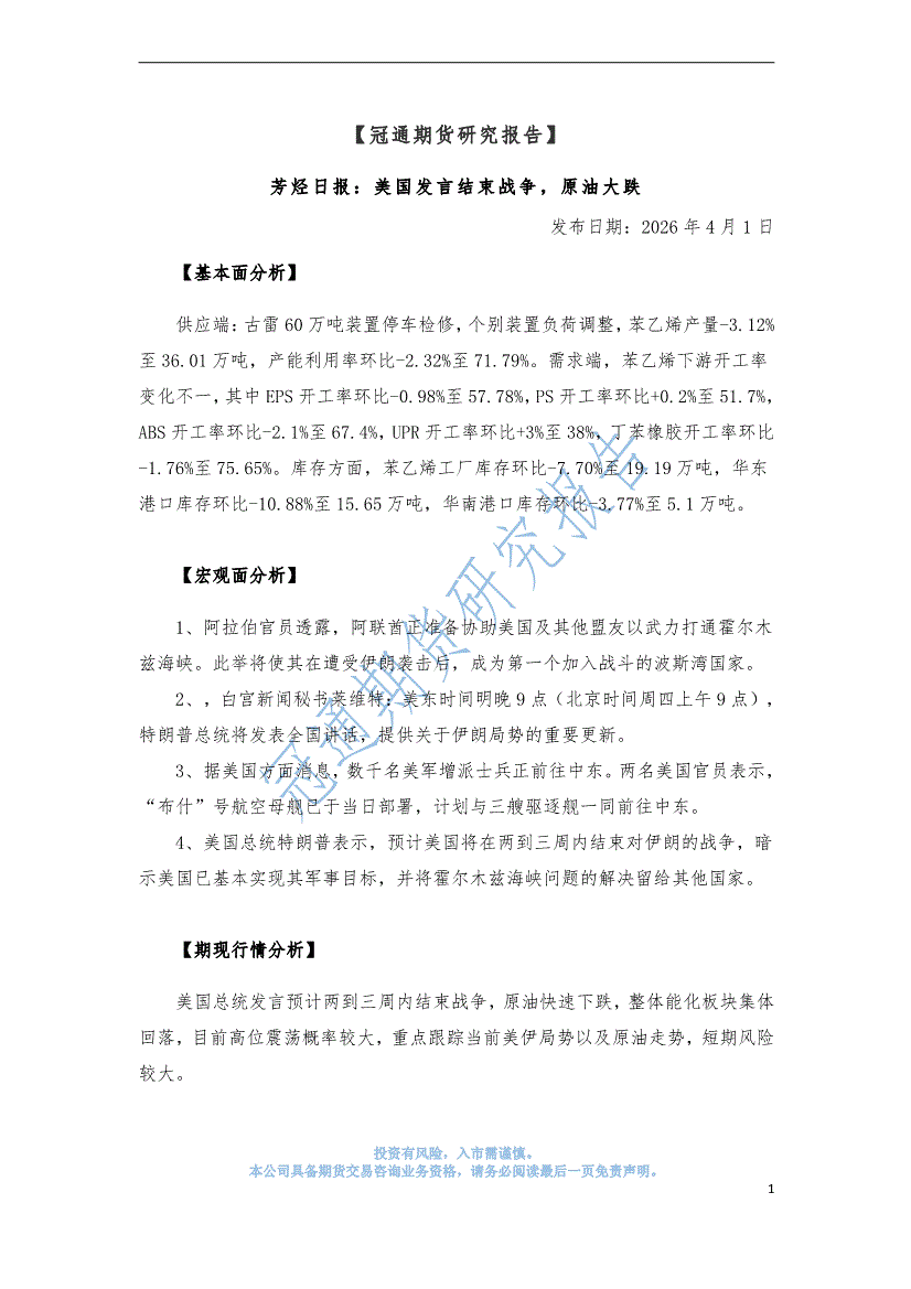 冠通期货-芳烃日报:美国发言结束战争,原油大跌-260401