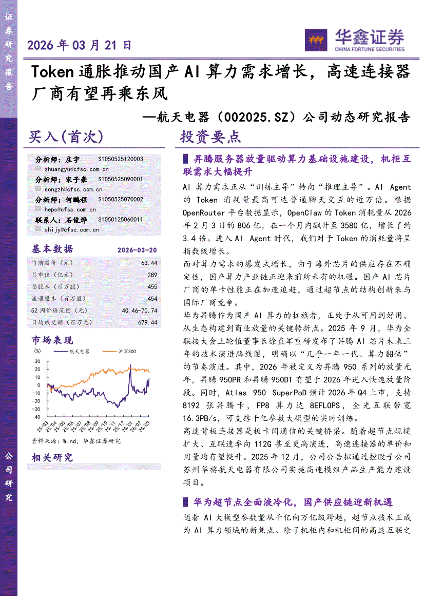 航天电器:华鑫证券-航天电器-002025-公司动态研究报告:Token通胀推动国产AI算力需求增长,高速连接器厂商有望再乘东风-260321