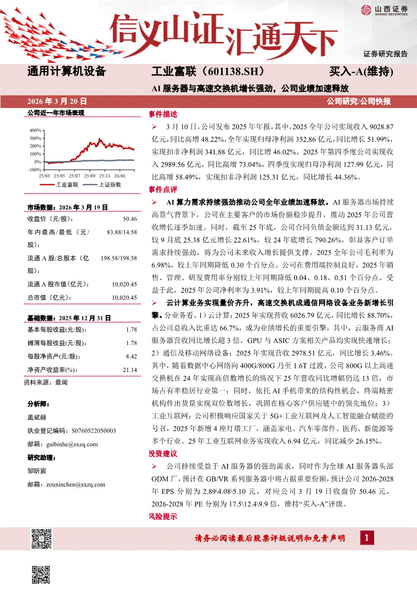工业富联:山西证券-工业富联-601138-AI服务器与高速交换机增长强劲,公司业绩加速释放-260320