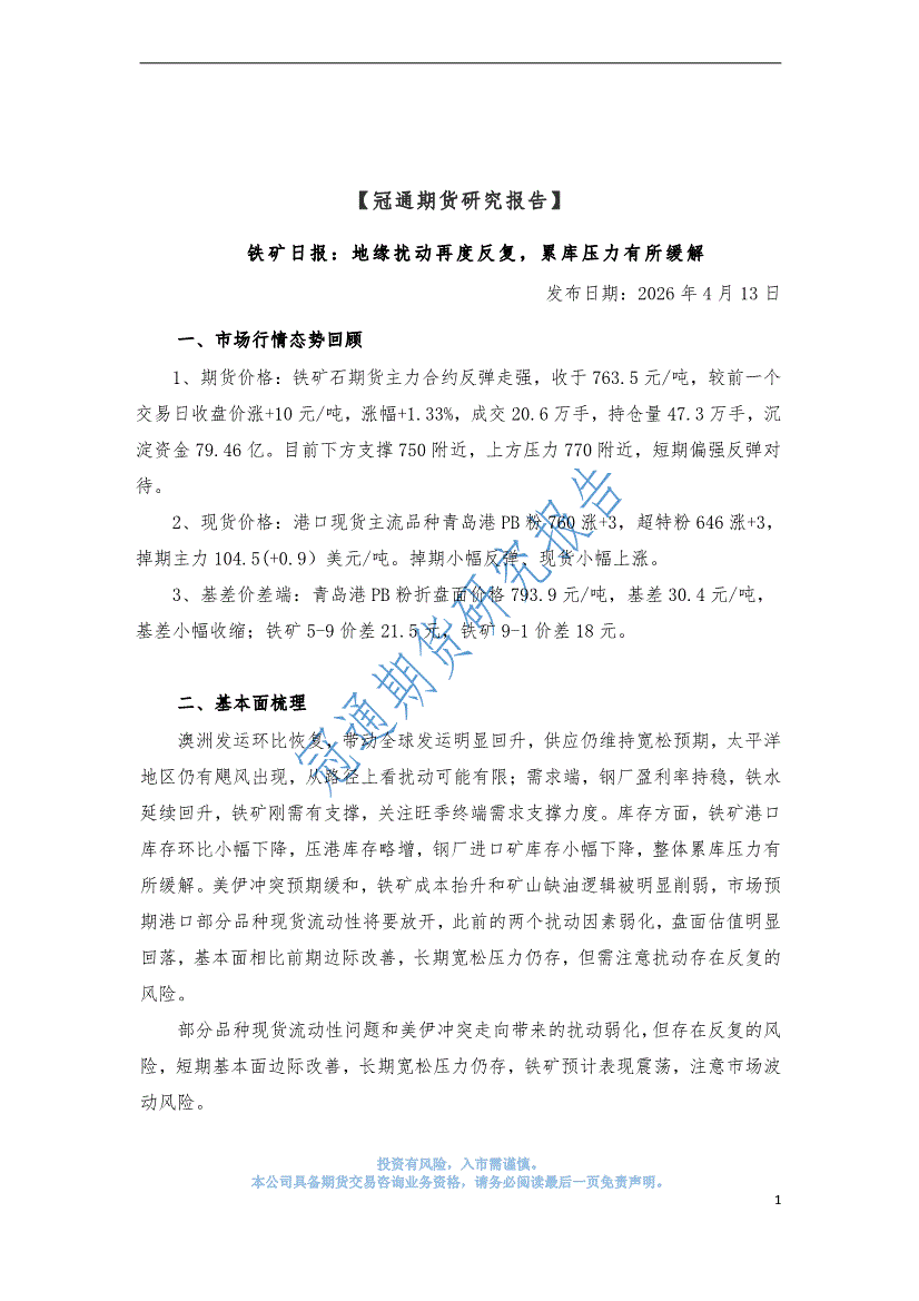 冠通期货-铁矿日报:地缘扰动再度反复,累库压力有所缓解-260413