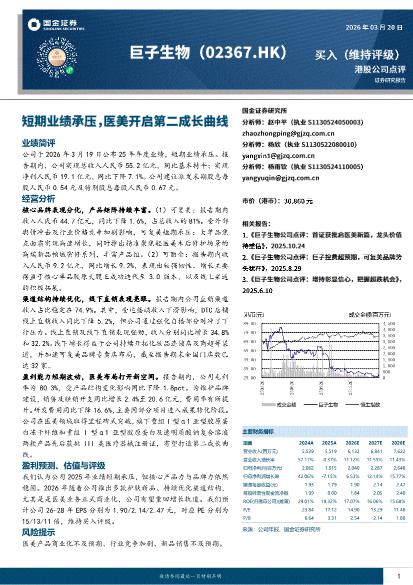 巨子生物:国金证券-巨子生物-2367.HK-短期业绩承压,医美开启第二成长曲线-260320