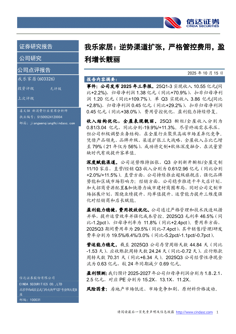 我乐家居:信达证券-我乐家居-603326-逆势渠道扩张,严格管控费用,盈利增长靓丽-251015