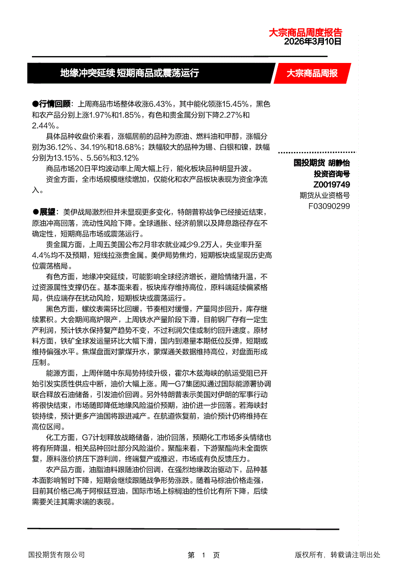 国投期货-大宗商品周报:地缘冲突延续,短期商品或震荡运行-260310
