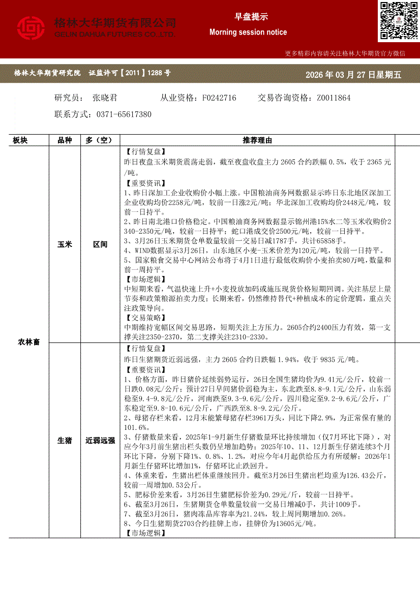 格林大华期货-早盘提示:玉米生猪鸡蛋-260327