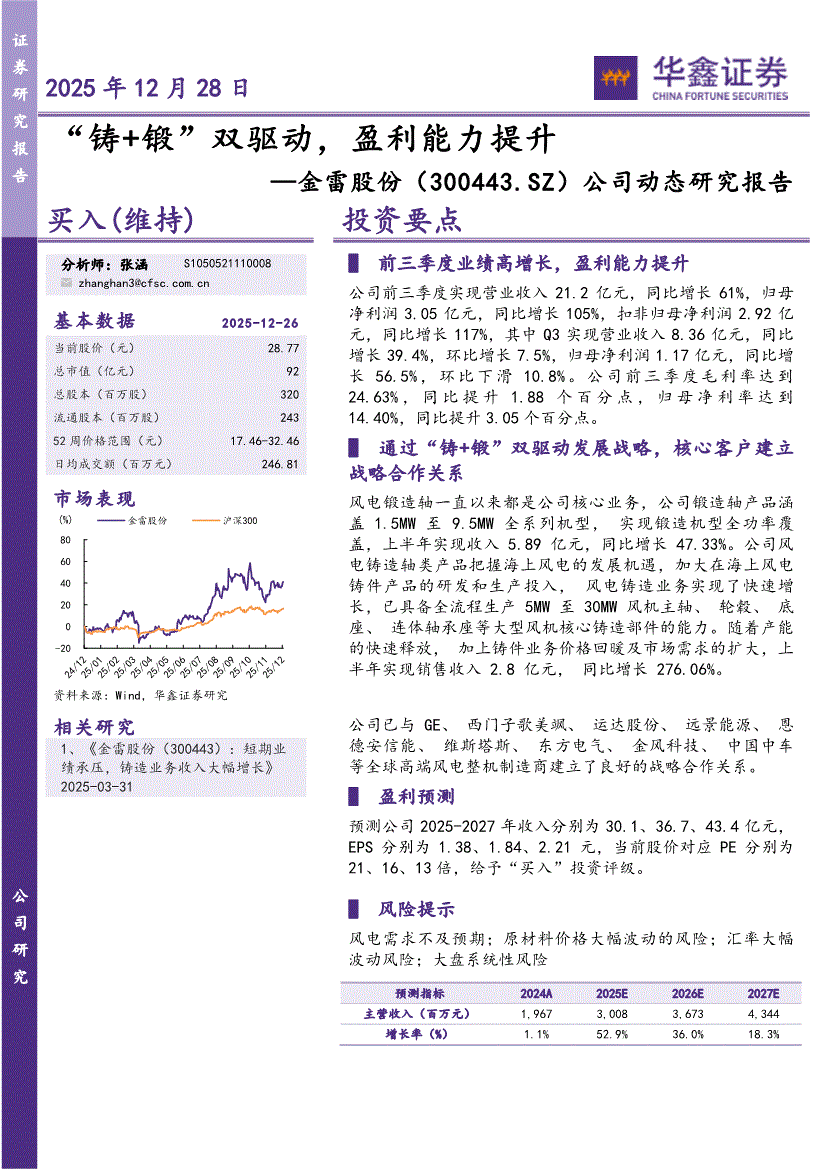 金雷股份:华鑫证券-金雷股份-300443-公司动态研究报告:“铸+锻”双驱动,盈利能力提升-251228