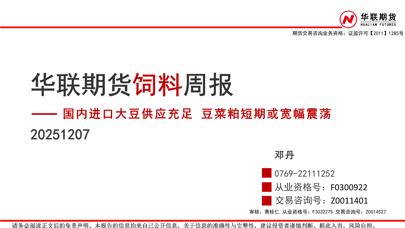 华联期货-饲料周报:国内进口大豆供应充足,豆菜粕短期或宽幅震荡-251207