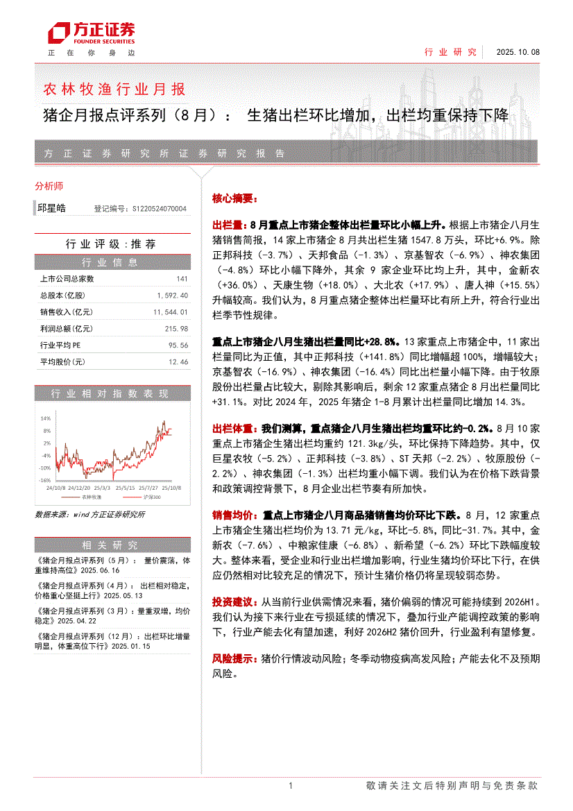 农林牧渔行业:方正证券-农林牧渔行业月报:猪企月报点评系列(8月),生猪出栏环比增加,出栏均重保持下降-251008