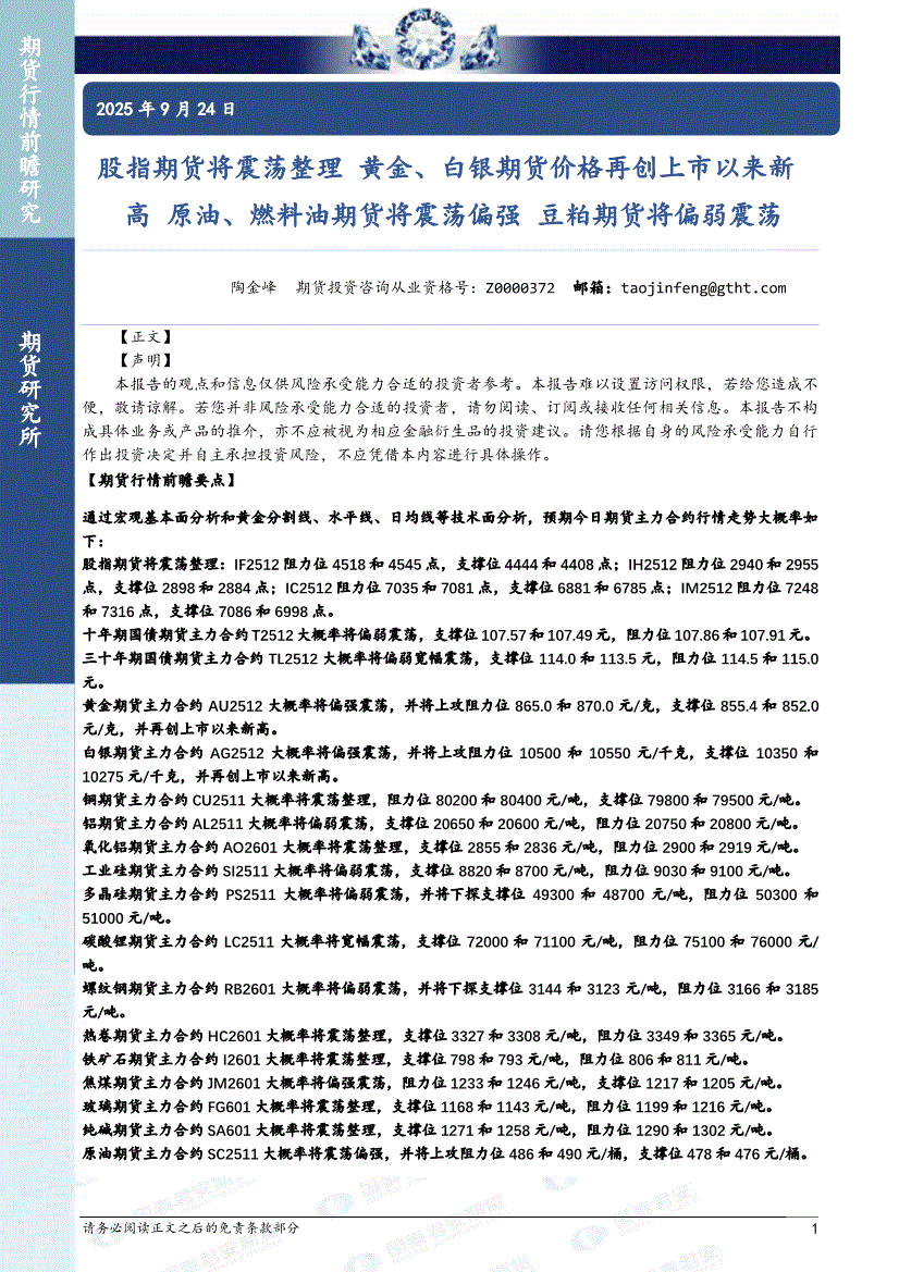 国泰君安期货-股指期货将震荡整理,黄金、白银期货价格再创上市以来新高,原油、燃料油期货将震荡偏强,豆粕期货将偏弱震荡-250924